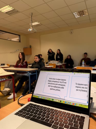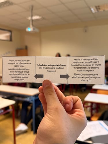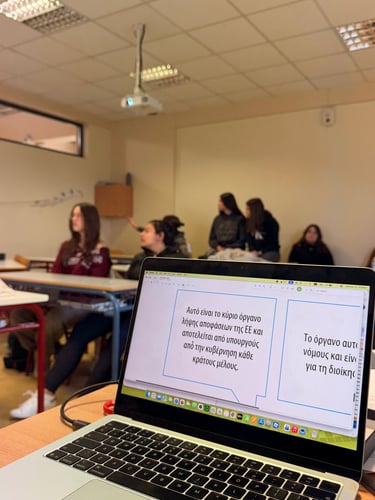 The second half of the lesson shifted focus to a practical exploration of how European institutions function through an immersive legislative role-play. Students assumed the roles of the European Commission and Members of the European Parliament, actively presenting their proposals and voting on recommendations just as real politicians do. The session also helped clarify the distinct roles of key EU bodies, allowing students to match clues to the correct branch of government. Ultimately, the outcome of this lesson gave students a solid grasp of how the EU is responsive and accountable, equipping them with the confidence to make their voices heard and actively engage in political decisions that impact their daily lives.