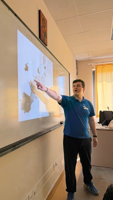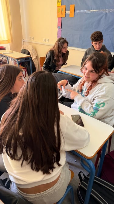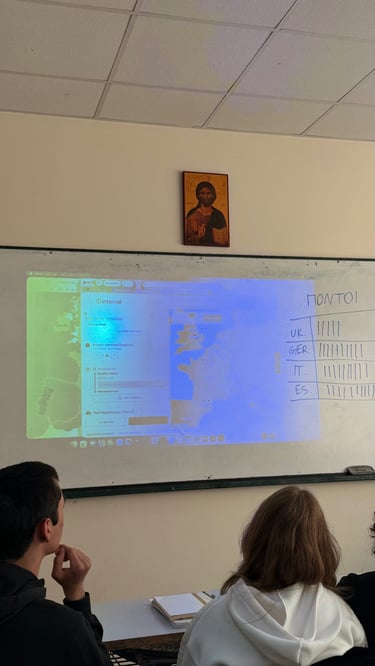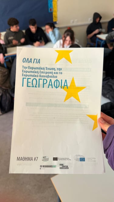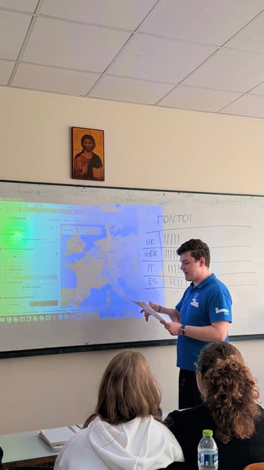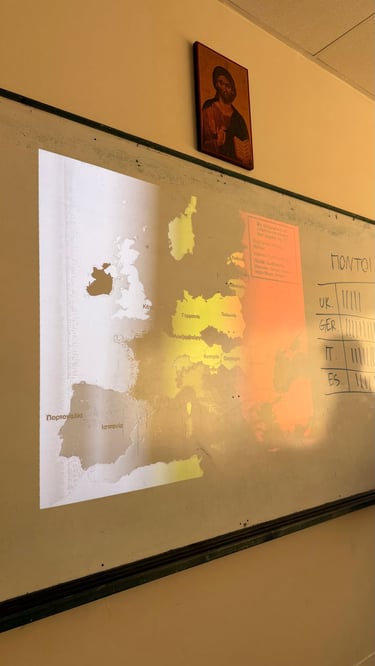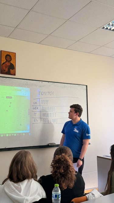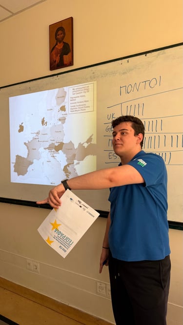 In Lesson H - All About: Geography, students participated in an interactive workshop centred around the "EU-Rail" educational game. Working in teams with a map of Europe, an Interrail ticket, and a simulated budget, participants planned a cross-continent journey to collect points. At each destination, students had to unlock their next move by completing "Country Cards," which required them to research capital cities, translate basic phrases into the local language, and identify famous landmarks. The groups also hunted for bonus points by finding geographical connections, such as rivers that cross multiple borders or towns twinned with those in Greece, turning factual research into a highly engaging and competitive collaborative activity.